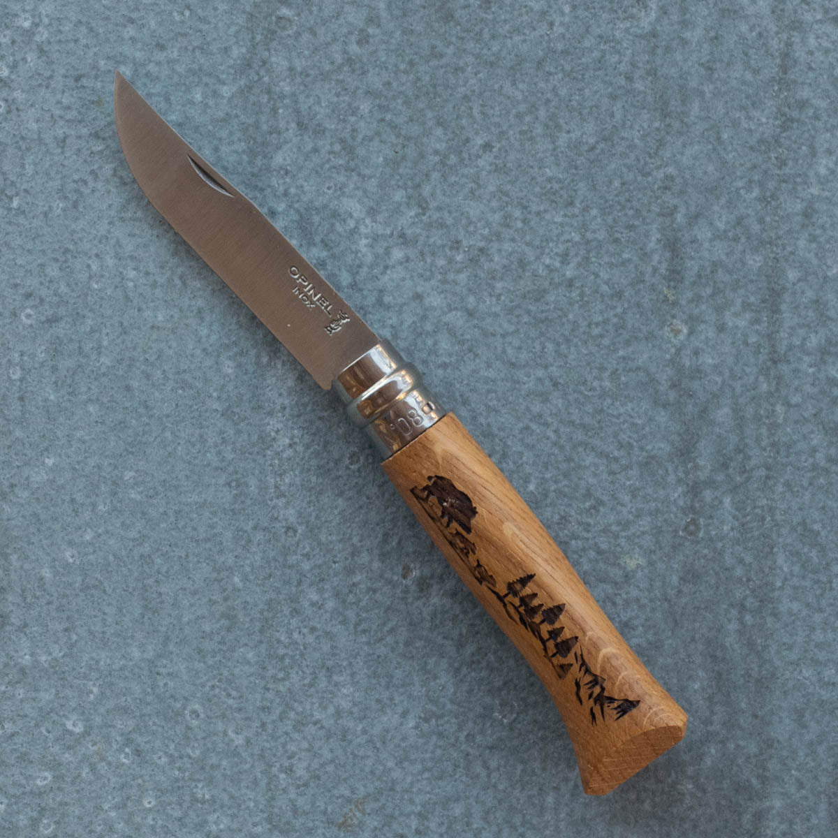 Opinel's No. 8 stainless steel blade and oakwood handle pocket knife with game hunting designs; deer, dog, hare, mountain goat, and wild boar. Features Opinel's trademark safety ring, which locks...